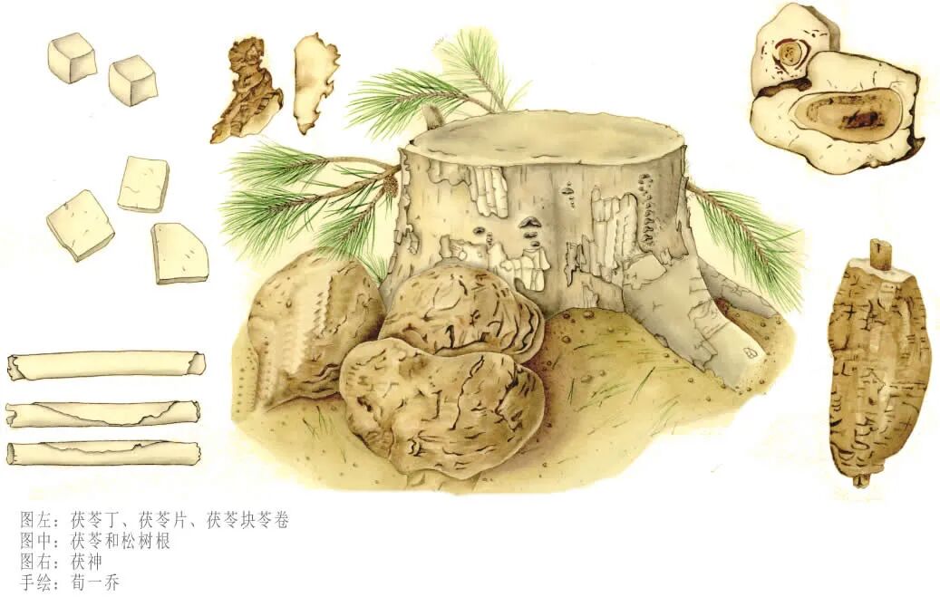 茯苓又叫云苓、玉灵、白茯苓,为多孔菌科植物茯苓的干燥菌核。寄生于松科植物赤松或马尾松等树根上,深入地下20~30厘米。分布河北、河南、山东、安徽、浙江、福建、广东、广西、湖南、湖北、四川、贵州、云南、山西等地。一般在7月至次年3月间到马尾松林中采取。反复“发汗”,阴干,再稍蒸,晒干,或鲜茯苓阴干。