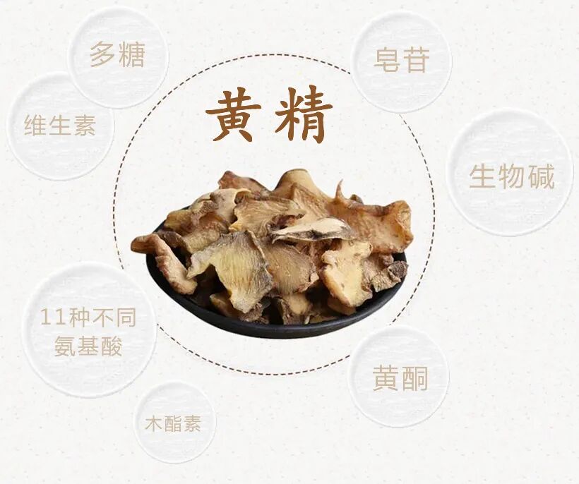 黄精含有多糖、皂苷、黄酮、木脂素、氨基酸、醌类化合物、维生素、生物碱及多种微量元素等成分,甾体皂苷类成分,如薯蓣皂苷元、毛地黄糖苷、菝葜皂苷元等;黄酮类成分有芹菜黄素等。多糖糖含量为26.78%~46.40%,总蒽醌含量为0.0726%~0.128%。另含吖丁啶羧酸、天门冬氨酸、高丝氨酸牡荆素木糖苷、异甘草素玻、丁香脂素、14a-羟基西伯利亚蓼苷A、滇黄精苷A等